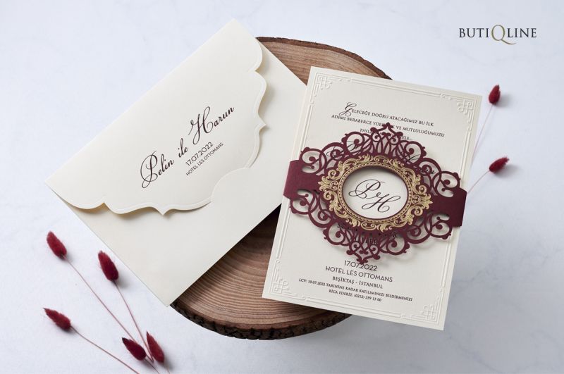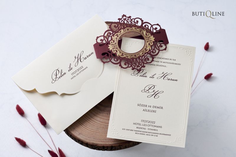 Davetiyeler görselde görüldüğü gibidir. Görselde yer alan zarf ve davetiye aksesuarları fiyatlara dahildir