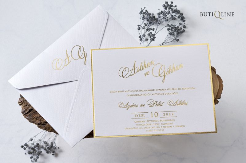 Davetiyeler görselde görüldüğü gibidir. Görselde yer alan zarf ve davetiye aksesuarları fiyatlara dahildir