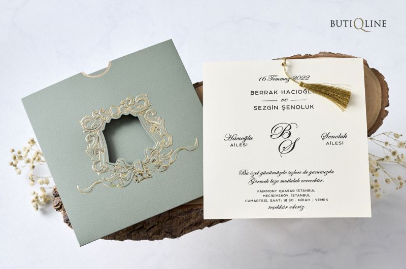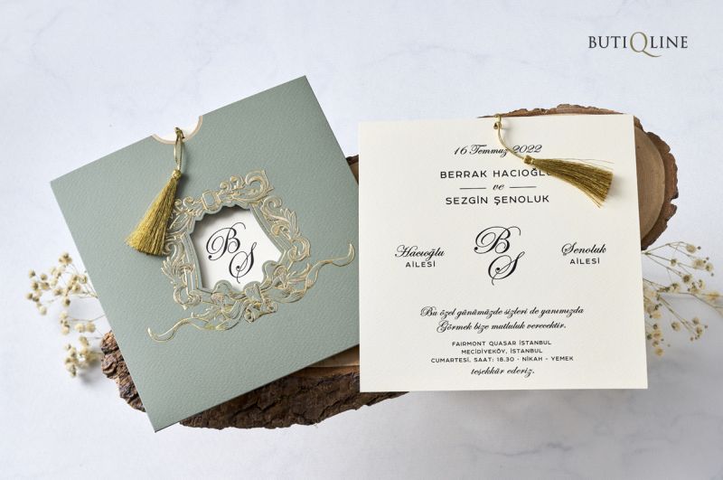 Davetiyeler görselde görüldüğü gibidir. Görselde yer alan zarf ve davetiye aksesuarları fiyatlara dahildir