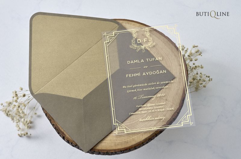 Davetiyeler görselde görüldüğü gibidir. Görselde yer alan zarf ve davetiye aksesuarları fiyatlara dahildir