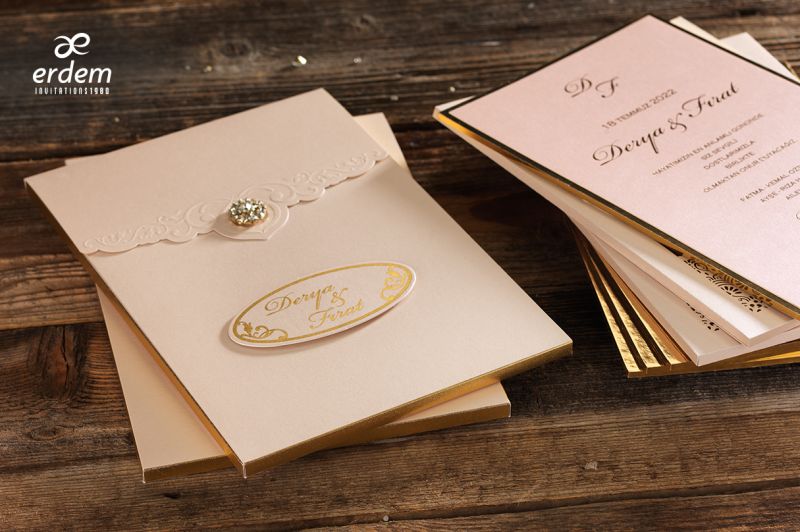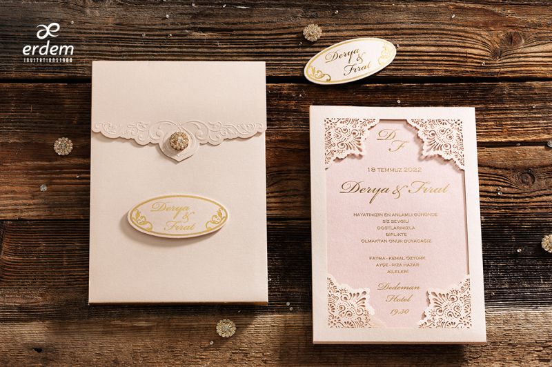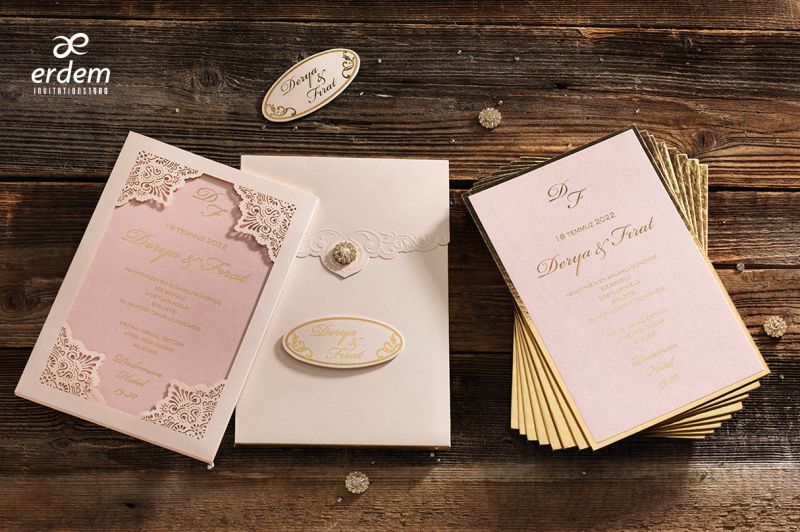 Davetiyeler görselde görüldüğü gibidir. Görselde yer alan zarf ve davetiye aksesuarları fiyatlara dahildir