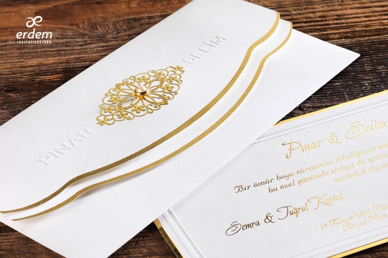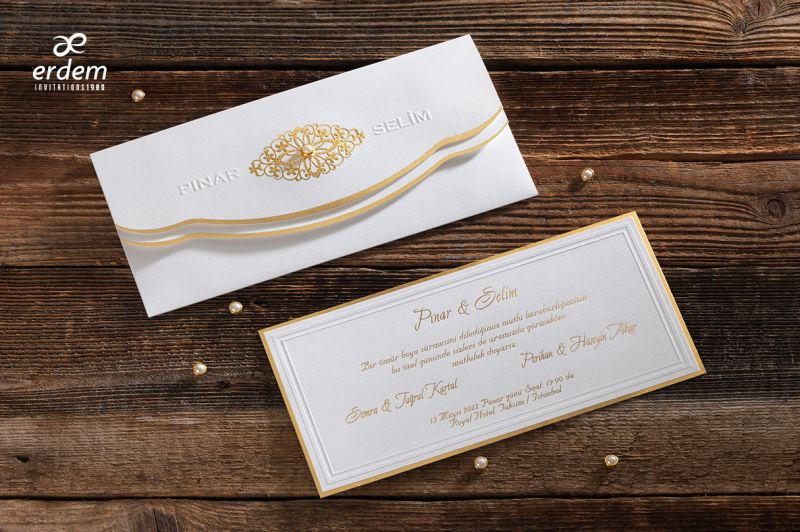 Davetiyeler görselde görüldüğü gibidir. Görselde yer alan zarf ve davetiye aksesuarları fiyatlara dahildir