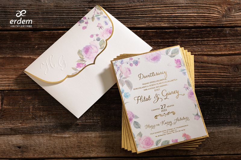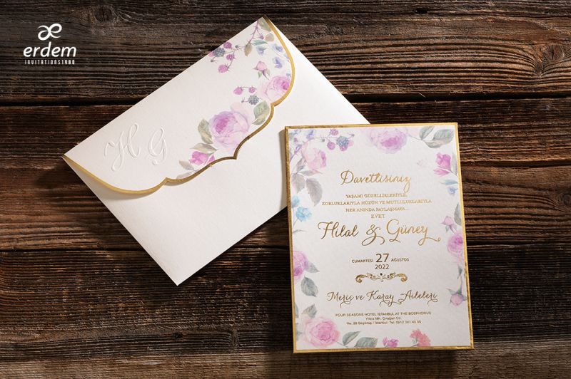 Davetiyeler görselde görüldüğü gibidir. Görselde yer alan zarf ve davetiye aksesuarları fiyatlara dahildir