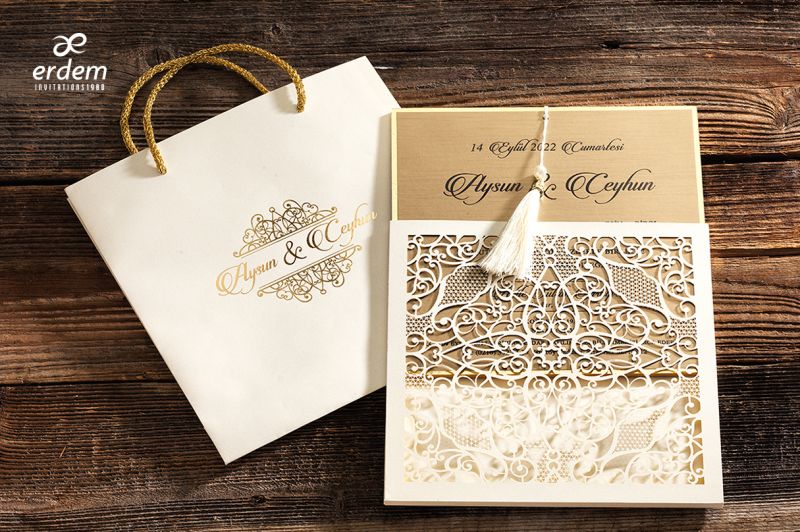 Davetiyeler görselde görüldüğü gibidir. Görselde yer alan zarf ve davetiye aksesuarları fiyatlara dahildir