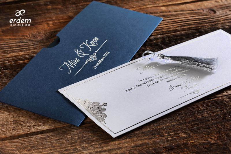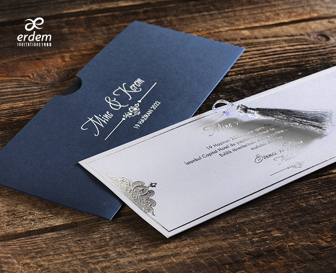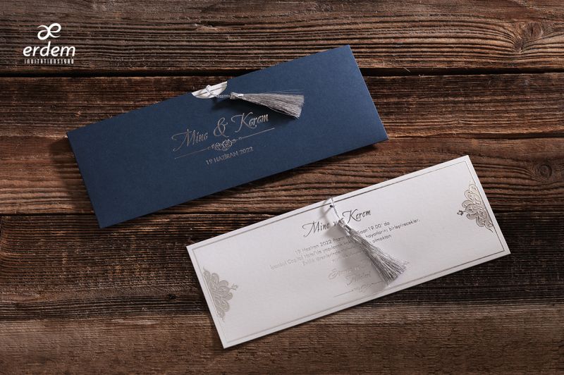 Davetiyeler görselde görüldüğü gibidir. Görselde yer alan zarf ve davetiye aksesuarları fiyatlara dahildir