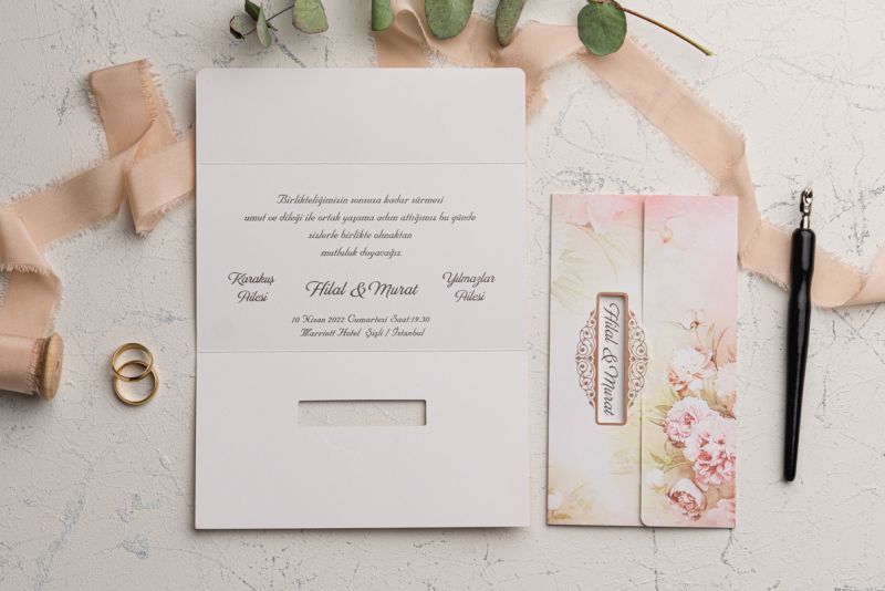 Davetiyeler görselde görüldüğü gibidir. Görselde yer alan zarf ve davetiye aksesuarları fiyatlara dahildir
