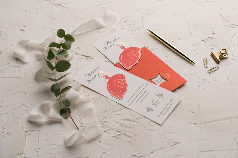 Davetiyeler görselde görüldüğü gibidir. Görselde yer alan zarf ve davetiye aksesuarları fiyatlara dahildir