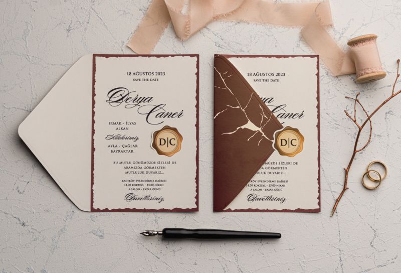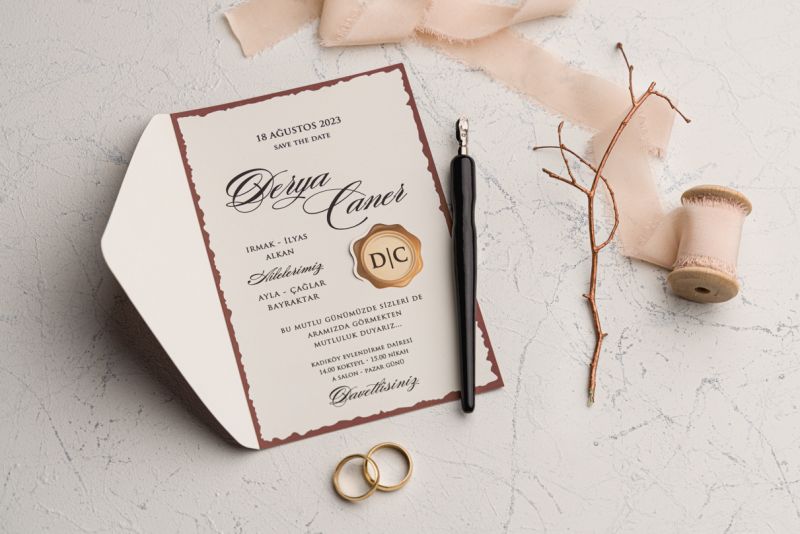 Davetiyeler görselde görüldüğü gibidir. Görselde yer alan zarf ve davetiye aksesuarları fiyatlara dahildir